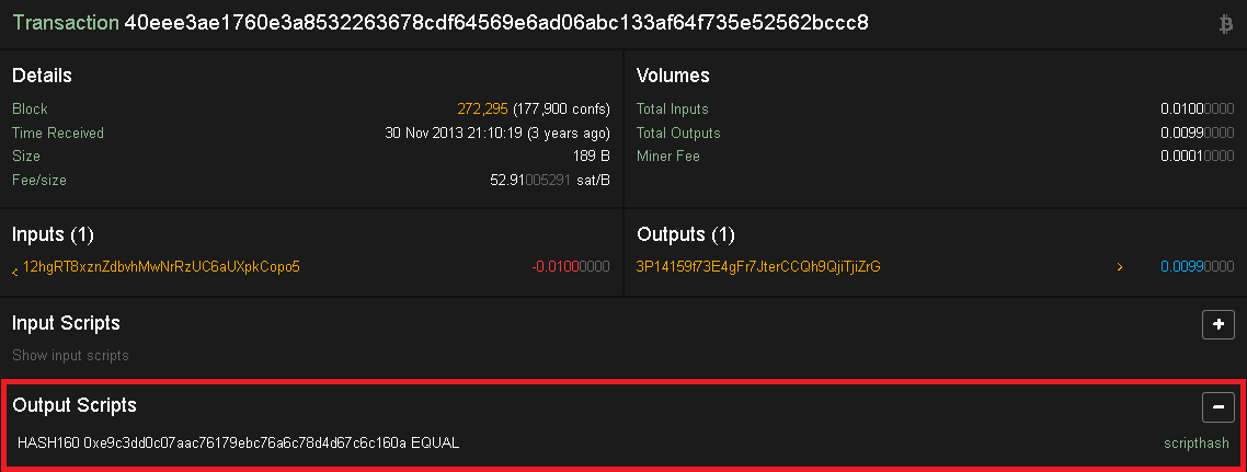 Transaksi ini menggunakan P2SH, sehingga transaksi dapat dikirim menggunakan script hash. Biasanya, transaksi ini ditandai dengan address yang diawali dengan angka “3”, dan banyak juga digunakan pada script multi signature.