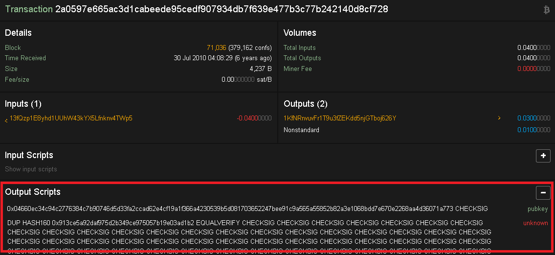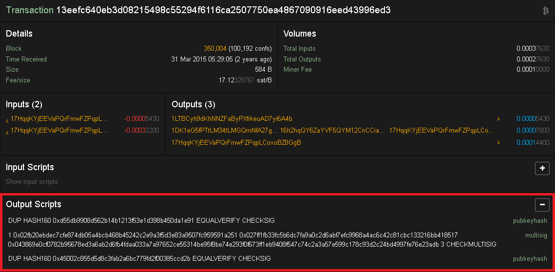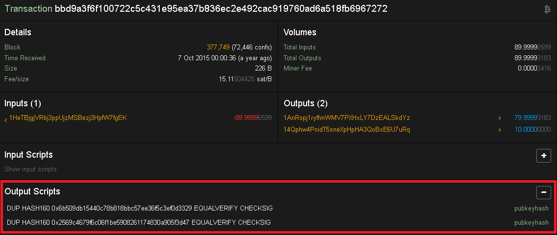 Transaksi jenis ini adalah transaksi standar dari Address A ke B. Kebanyakan pada tipe transaksi ini menggunakan P2PKH (Pay to Public Key Hash). Lihat gambar dibawah ini untuk melihat perbedaan output script: