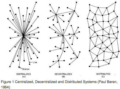 Untuk memberi gambaran yang lebih jelas, cara yang paling mudah adalah dengan melihat perbedaan karakter antara pola yang terdesentralisasi, dengan yang terpusat, sekaligus bagaimana pola terdistribusi berikut: