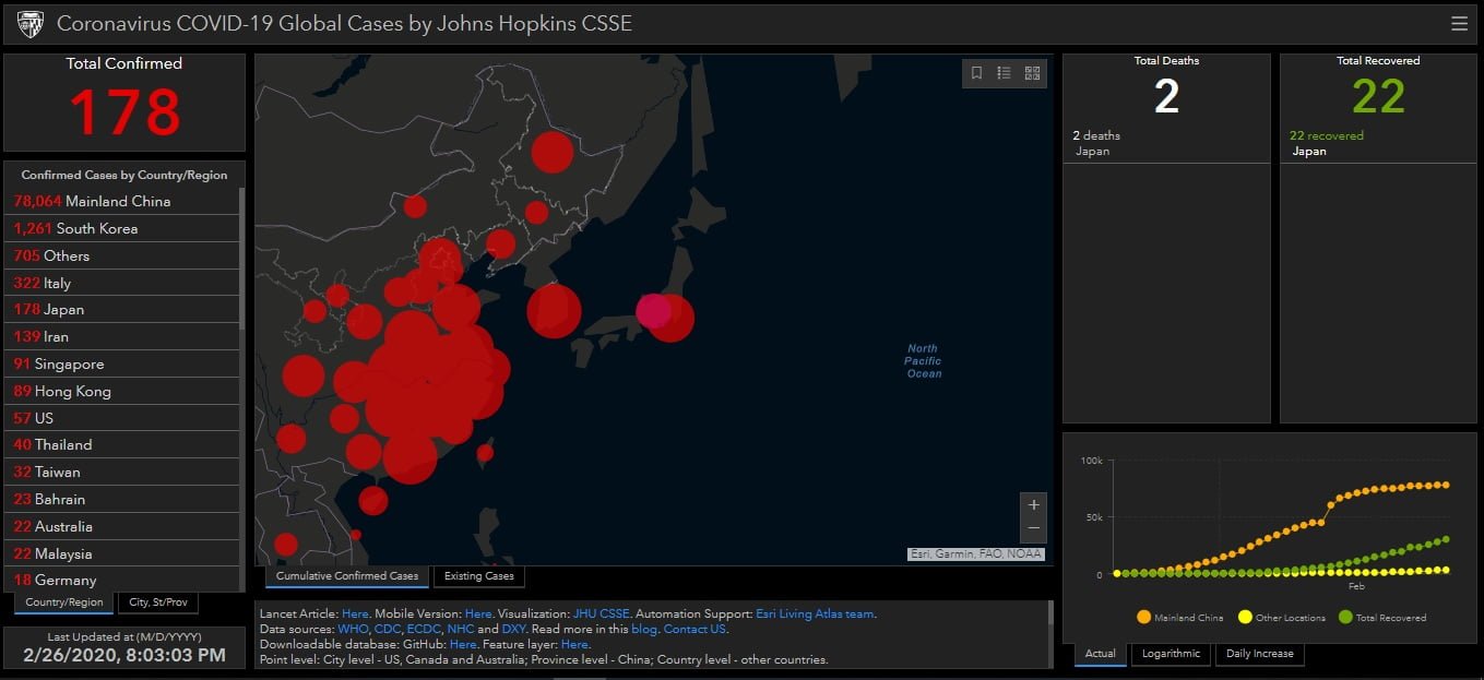 Total keseluruhan sebaran virus Corona saat ini berdasakan data dari John Hopkins CSSE berjumlah 81.191 yang terpapar. Jumlah meninggal sampai hari ini (26/2/2020) adalah 2.768 orang, dengan total 30.279 orang yang dinyatakan sembuh. Lokasi terbesar paparan virus Corona masih di China, dan Korea Selatan di posisi kedua terbanyak.