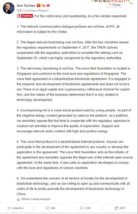 Melalui akun Weibo, Justin membantah semua tuduhan dan semua rumor yang dialamatkan kepada dirinya. Justin mengatakan bahwa semua tuduhan penggalangan dana ilegal itu tidak benar. Justin mengaku, bahwa Tron selama ini telah mematuhi pihak regulator. Bahkan telah mengembalikan dana investor ICO pada 20 September di tahun 2017 silam.