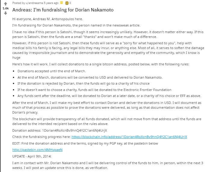 Di tahun yang sama, sekitar bulan Maret 2014, Andreas Antonopoulos memposting penggalangan dana untuk Dorian Nakamoto di Reddit.