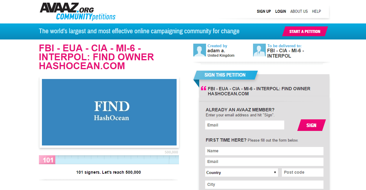 User HashOcean Membuat Petisi Di Avaaz Meminta Agar Penegak Hukum Menemukan Pemilik HashOcean