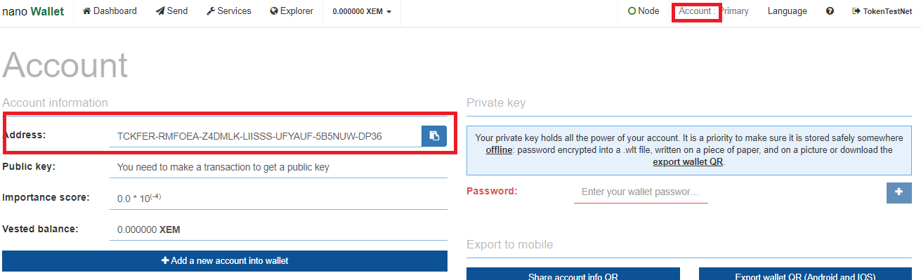 - Sekarang lakukan deposit 200 XEM (versi demo alias Tesnet) ke NanoWallet. Untuk melihat alamat wallet Anda, klik Account di sudut kanan atas. Address yang saya miliki: TCKFER-RMFOEA-Z4DMLK-LIISSS-UFYAUF-5B5NUW-DP36. Address yang berada pada jaringan TestNet, selalu diawali dengan huruf “T” sedangkan Mainnet diawali dengan huruf “N”.