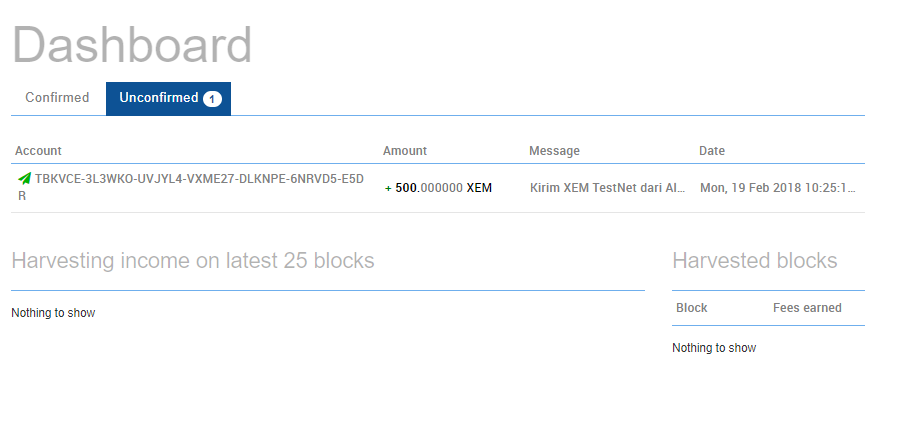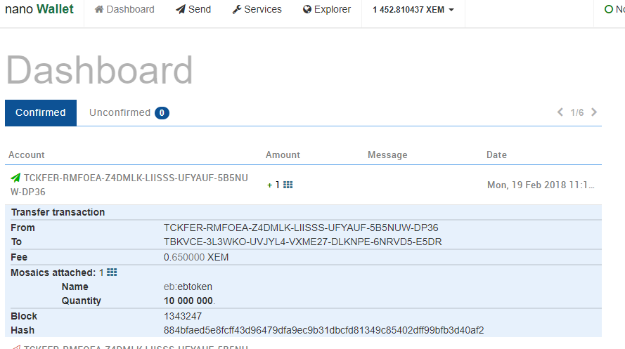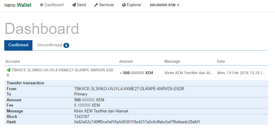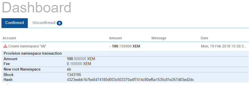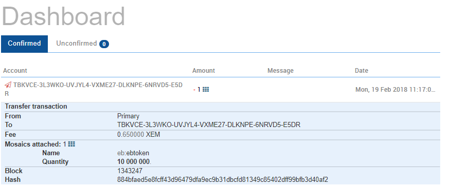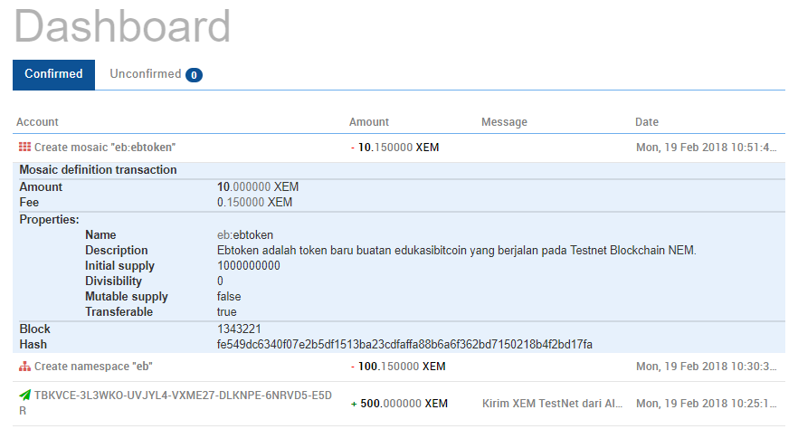 - Klik Dashboard dan perhatikan terdapat transaksi pembuatan mosaic/token yang baru. Jikalau belum terkonfirmasi, maka masih terlihat di tab Unconfirmed. Proses ini biasanya tak berlangsung lama, bergantung pada node Blockchain NEM yang sedang aktif atau akses Internet Anda.