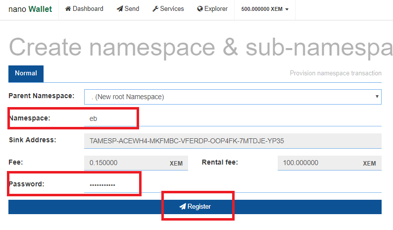 - Klik menu Services di bagian atas, lalu klik Create new namespace di bagian Namespaces & Subdomains. Di bagian Namespace, ketikkan nama yang Anda inginkan, masukkan password lalu klik Register.
