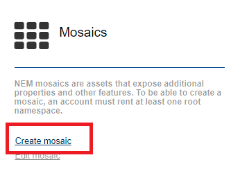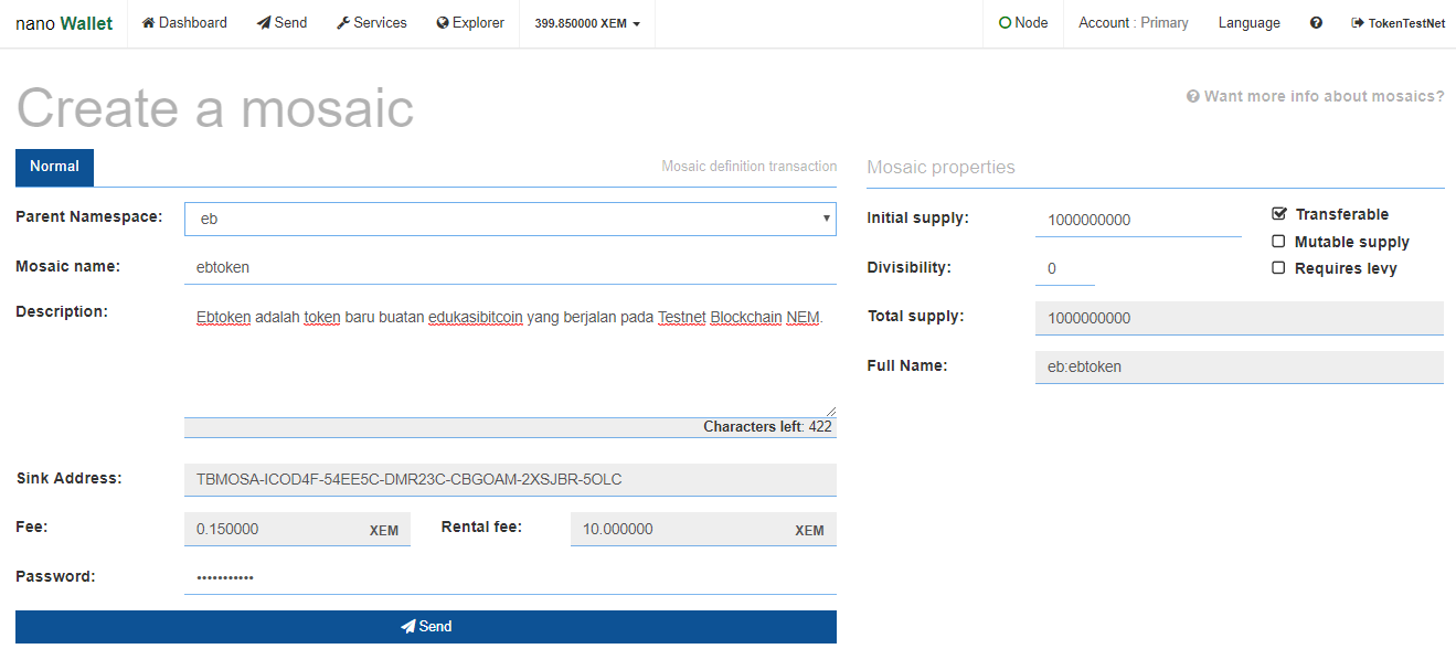 Token dalam sistem Blockchain NEM disebut sebagai Mosaic. Mosaic inilah yang akan menempati namespace “eb” yang telah ada sebelumnya. Anda dapat membuat Mosaic yang tak terbatas dengan satu namespace saja.