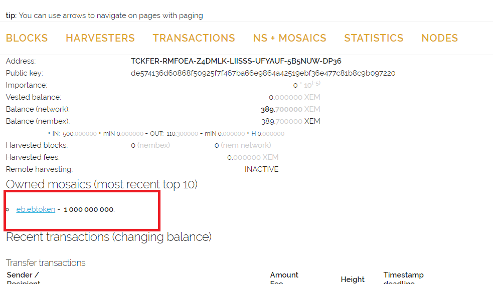 - Untuk memastikan namespace dan mosaic terlihat di jaringan publik Blockchain NEM, gunakan Testnet Explorer: http://bob.nem.ninja:8765/ dan masukkan address wallet Anda. Di sana Anda dapat melihat keseluruhan transaksi termasuk bahwa address Anda tersebut telah memilliki namespace dan mosaic.