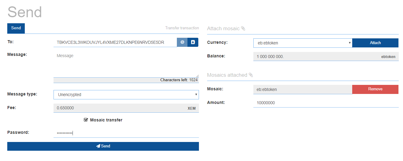 - Di bagian bawah kemudian muncul Mosaic Attached, lalu isi jumlah ebtoken yang akan dikirimkan, misalnya 10.000.000 unit.